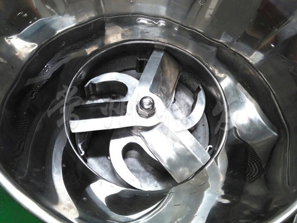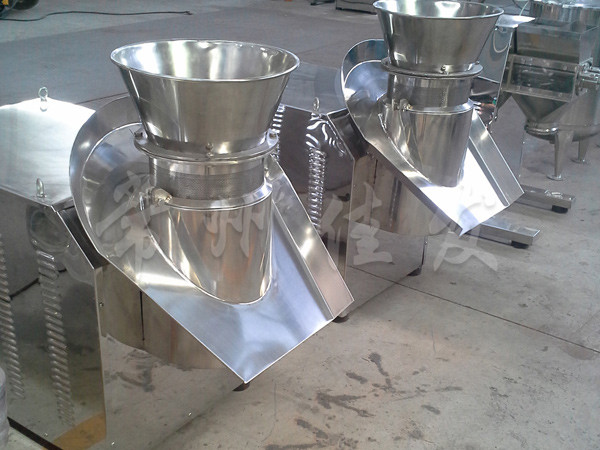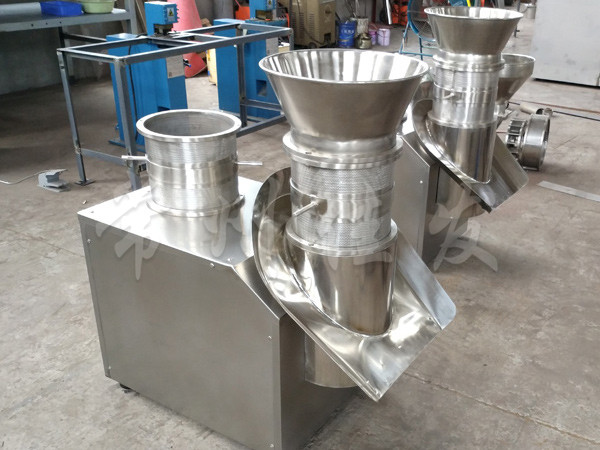 本機(jī)是通過一組旋轉(zhuǎn)碾刀,將前道工序制成的濕材注入環(huán)碾刀的不銹鋼篩筒篩孔中,從而制成圓柱狀的濕顆粒,供下道工序拋丸使用。本設(shè)備可通過更換不銹鋼篩筒來取得不同大小的顆粒。