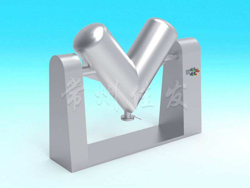 該機(jī)通過(guò)機(jī)械傳動(dòng),使不對(duì)稱的V型圓柱體內(nèi)的物料做往復(fù)翻動(dòng),達(dá)到均勻混合之目的。